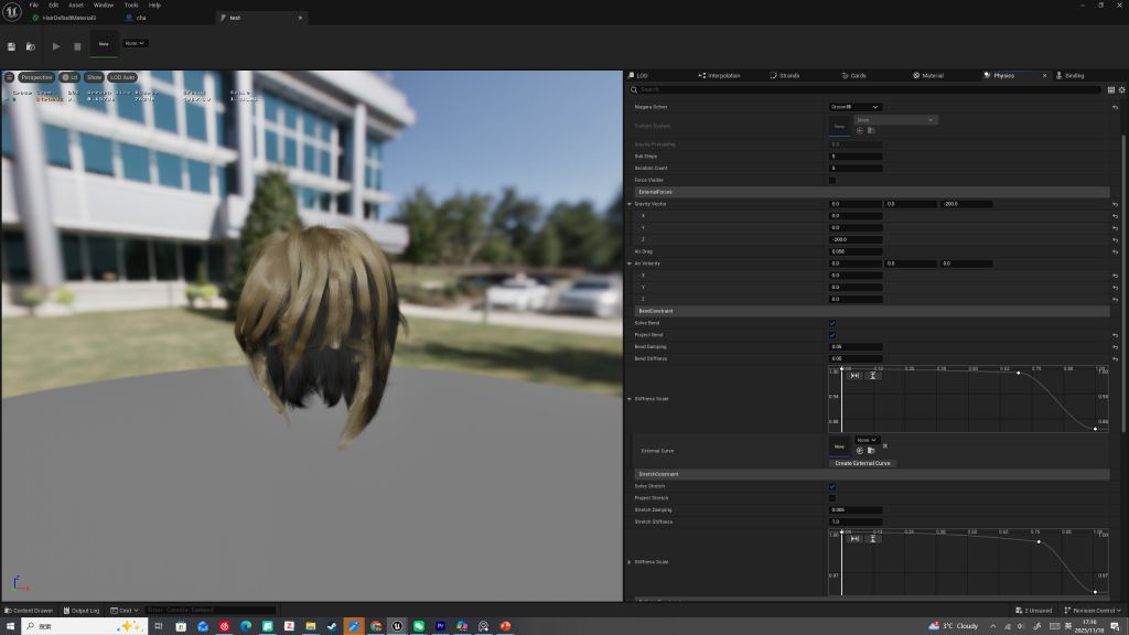 I set up the hair physics simulation using Unreal Engine’s built-in strand solver. I configured the relevant simulation parameters and curves to control hair behavior, ensuring realistic movement while maintaining performance suitable for real-time rendering.