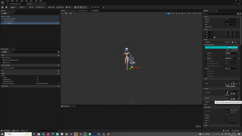 In UE, hair simulation focuses on functional movement—while the results are not perfect, it is fast to calculate and render. I created a character blueprint, placing the character’s skeletal mesh within it, essentially using the game engine’s standard logic.